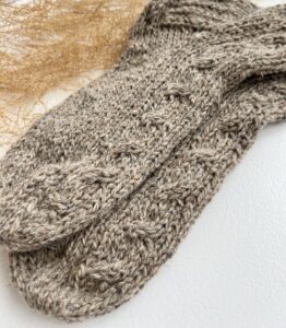 The socks are knitted from a blend of sheep and dog wool. Sheep wool provides softness and warmth, while dog wool adds strength and durability. This combination ensures excellent heat retention, allows the feet to breathe, and remains durable even with frequent wear.