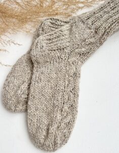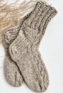 The socks are knitted from a blend of sheep and dog wool. Sheep wool provides softness and warmth, while dog wool adds strength and durability. This combination ensures excellent heat retention, allows the feet to breathe, and remains durable even with frequent wear.